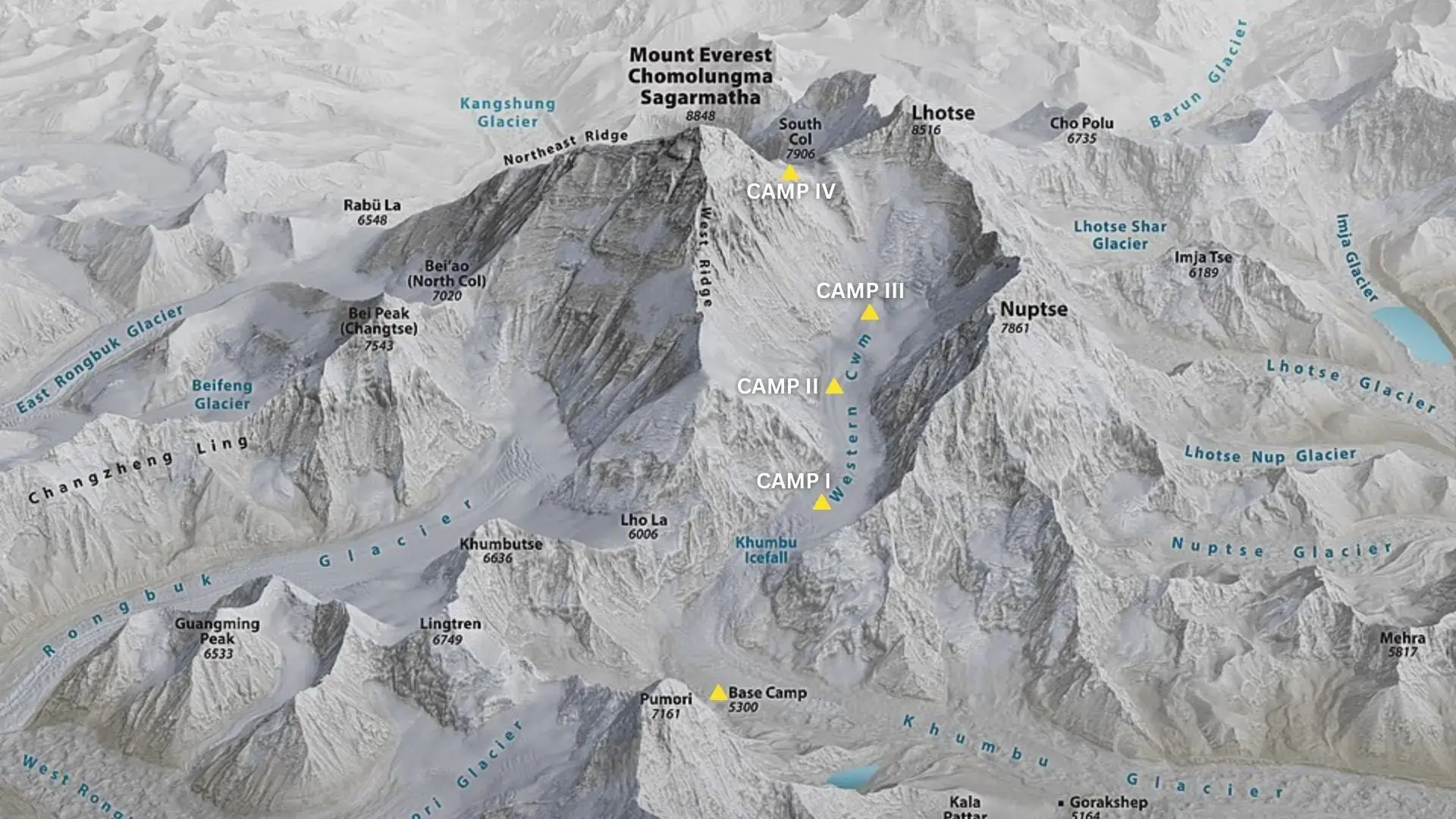 The path requires navigating through glaciers and ice-covered walls with heightened caution. Due to the extreme demands of this section, climbers typically make multiple rotations, ascending to Camp 3 and returning to Camp 2 to continue acclimatization before making their final push.