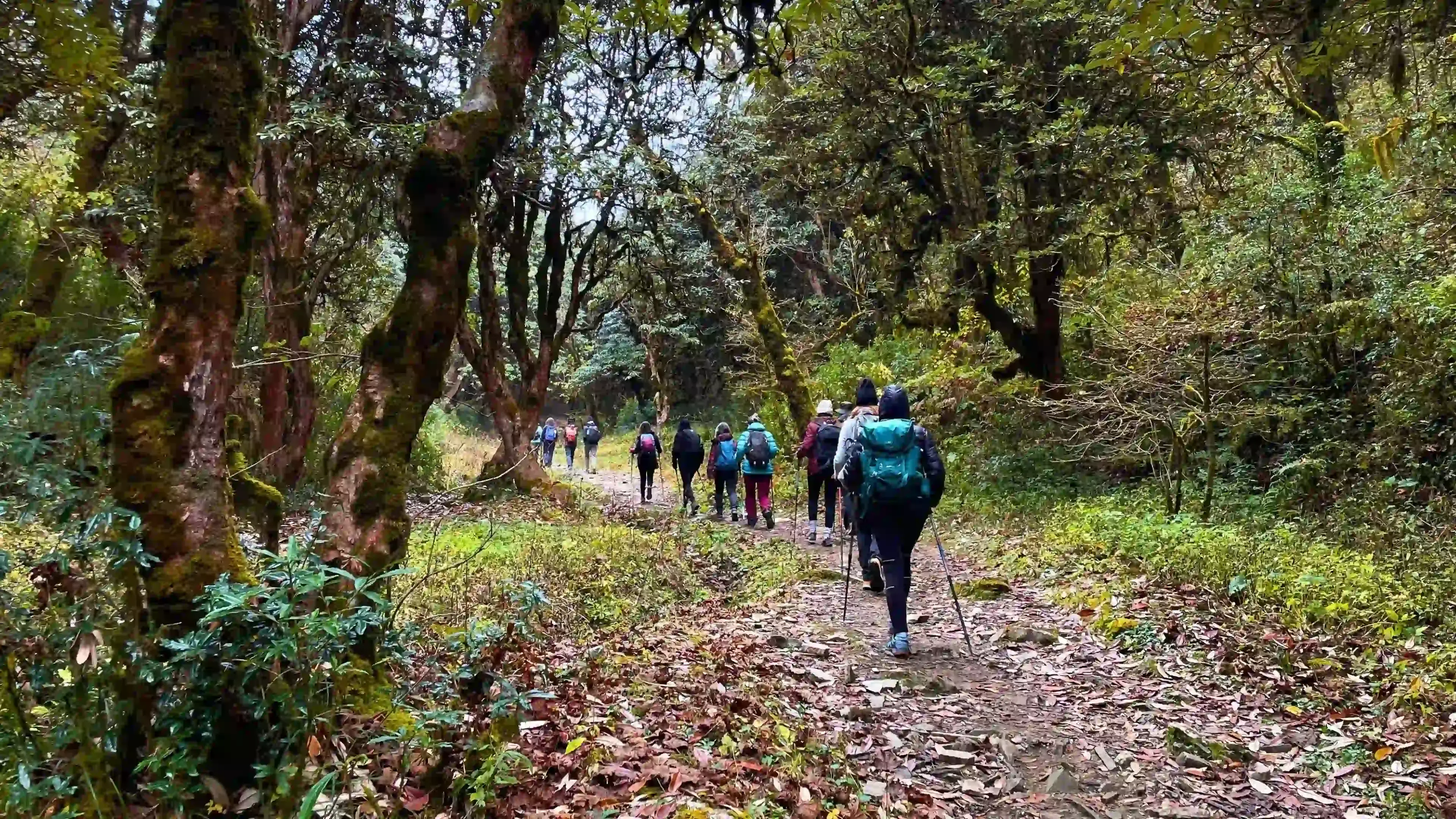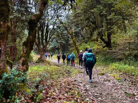 During spring (March–April), the trail is ablaze with blooming rhododendron forests, making the journey even more spectacular.