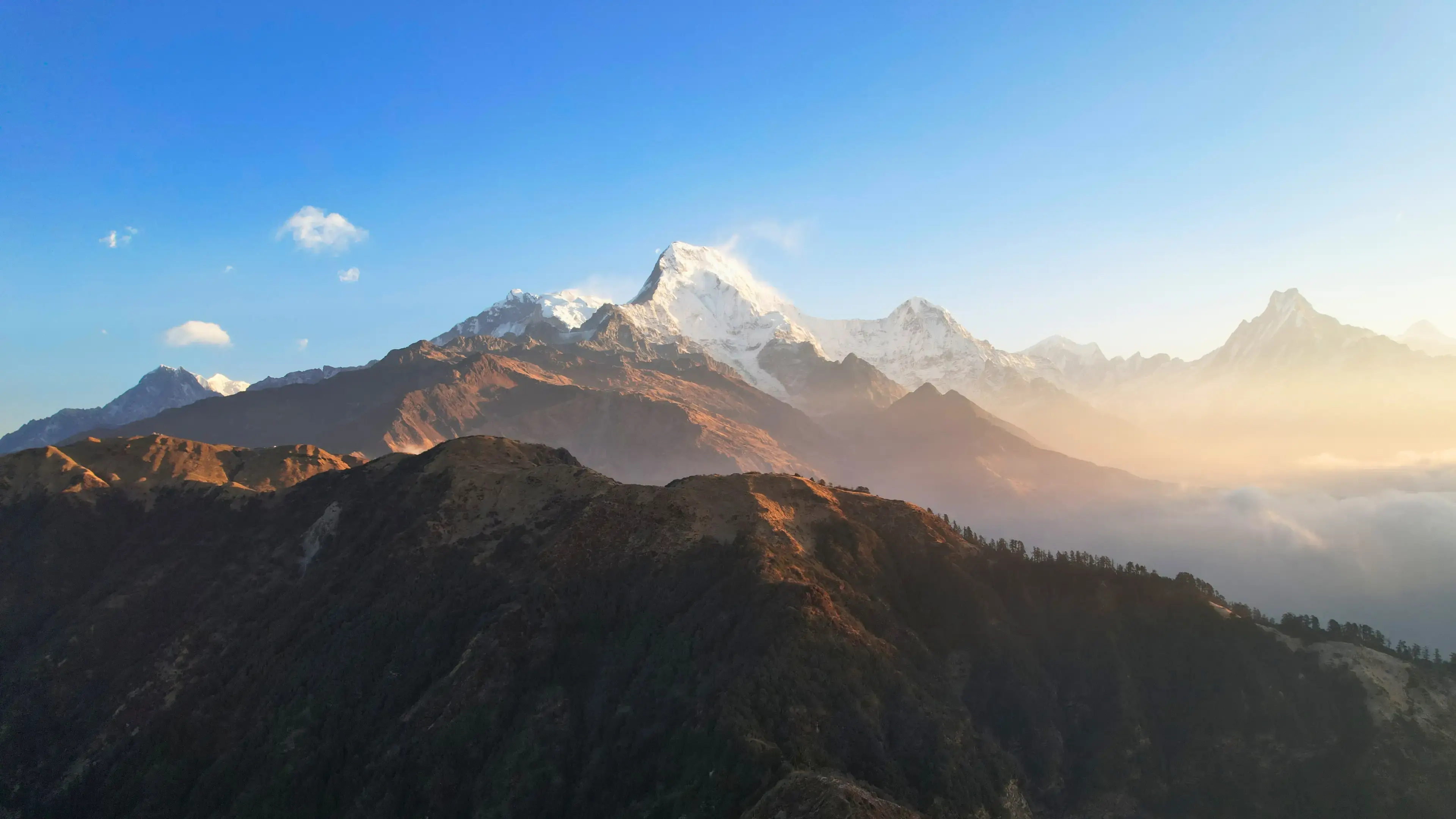 The highlight of the trek comes early the next morning with a pre-dawn hike to Poon Hill (3,210m). As the sky brightens, you’ll witness one of the most iconic sunrises in the Himalayas—golden rays touching the snowy peaks of Dhaulagiri, Annapurna I, Nilgiri, and Machapuchare. It’s a visual spectacle that feels both spiritual and surreal.
