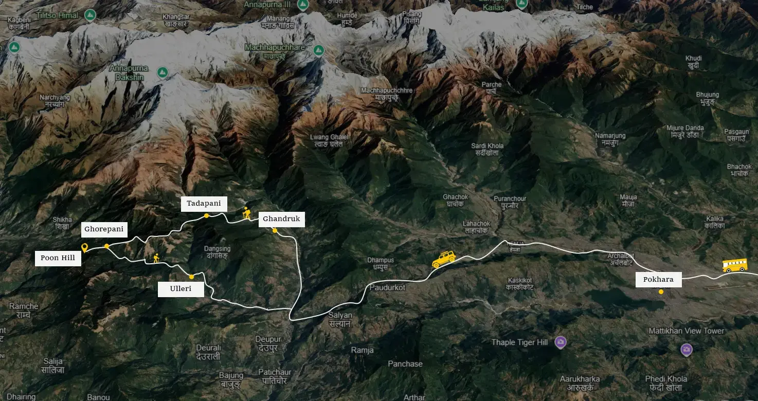 Ulleri (Trek End Point) to Pokhara: After your trek, another private jeep brings you back to Pokhara.