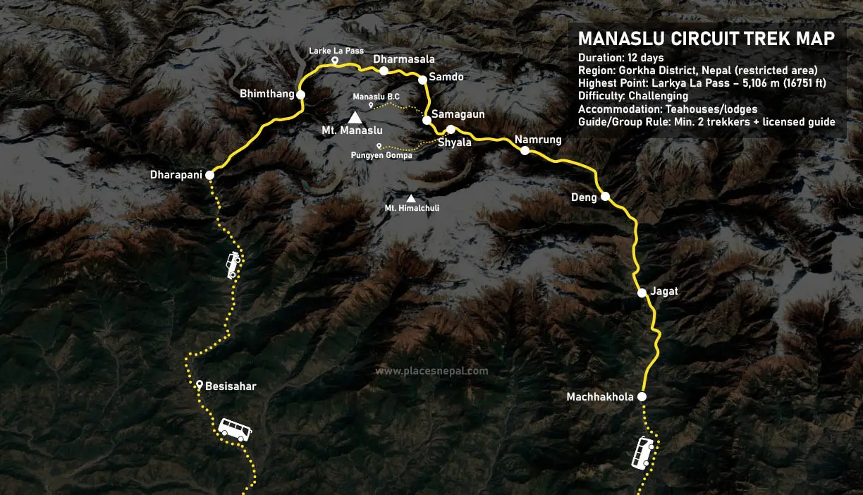 The Manaslu Circuit Trek map is a topographic guide that traces approximately 177 km of trail encircling Mount Manaslu (8,163 m). Starting at Soti Khola (710 m), the route follows the Budhi Gandaki Gorge, ascending steadily through Jagat (1,340 m), Deng (1,860 m), Namrung (2,630 m), and Samagaon (3,530 m). It then continues toward Samdo (3,875 m) before crossing the trek’s highest point, the Larkya La Pass (5,160 m). The descent transitions into the Annapurna region, passing Bimthang (3,720 m) and ending at Dharapani (1,860 m).