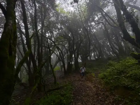 After breakfast at Forest Camp (2,540m), you'll begin your ascent to High Camp (3,550m), covering around 6–7 kilometers over 5 to 6 hours of trekking. The trail starts through dense forest, but as you climb higher, the trees thin out, revealing open spaces dotted with moss and shrubs. If you're trekking in March or April, you'll be treated to spectacular blooms of rhododendrons in vivid shades of red, pink, and white—turning the forest into a vibrant, natural garden.